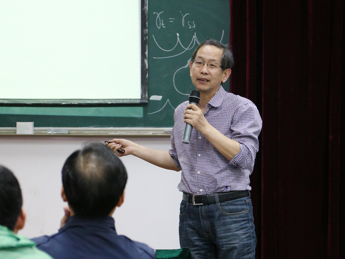 论坛上半场由张良云教授主持,两位家杰出青年获得者屈长征教授和楼森岳教授分别作了精彩的报告。屈长征教授主要从数学的角度出发、从经典的Cammasa-Holm方程入手,介绍了“可积方程尖峰孤子解的稳定性”的相关工作,以及与可积方程解的适定性问题相关若干最新进展;而楼森岳教授则从中国古代哲学思想“道生一,一生二...三生万物”出发,阐述了物理学中的一些基本原理,作了题目为fromnothing to everythingdiscrete integrable system的学术报告。在报告中,楼森岳教授介绍了“道生万物”与离散可积系统的内在联系、对现代物理学的意义以及急需解决的问题。报告内容深入浅出,通俗易懂,发人深思。