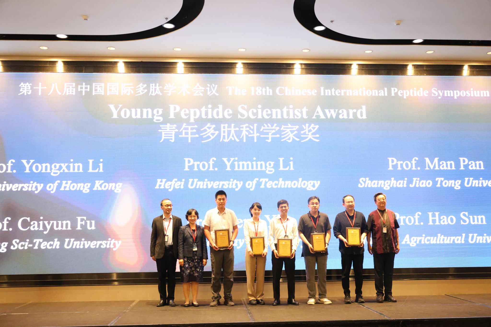 孙浩老师受会议组委会邀请做了报告,题目为“Diverse fate of ubiquitin chain moieties in proteasomal degradation and Total Chemical Synthesis of Interleukin-15”。孙浩课题组的研究方向为蛋白质化学合成与修饰,并致力于开发治疗肿瘤和病菌感染等疾病的多肽、蛋白质和多肽模拟物等药物。由于孙浩在多肽领域的科研成绩,他被会议学术委员会评选为“青年多肽科学家奖”(Young Peptide Scientist Award)。