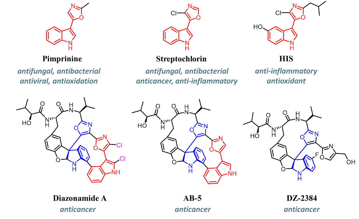 5-(3’-吲哚基)噁唑结构是一种独特的杂环骨架,存在于许多海洋天然产物和潜在的药物先导结构中。含有这种骨架的化合物,无论是天然源分离获取的,还是人工合成的衍生物,都表现出广泛的生物活性,例如Pimprinine(皮普利宁)和Streptochlorin(氯链素)两种天然产物都具有抗真菌和抗细菌活性,除此之外,皮普利宁表现出抗病毒和抗氧化活性,氯链素具有抗癌和抗炎活性。文章对含有5-(3’-吲哚基)噁唑结构的化合物包括抗癌、抗菌、抗病毒、抗氧化和抗炎等在内的众多生物活性进行了详细总结,涵盖团队前期研究发现5-(3’-吲哚基)噁唑类化合物表现出优异的农用生物活性,包括抗植物病原真菌、除草和杀虫活性等。