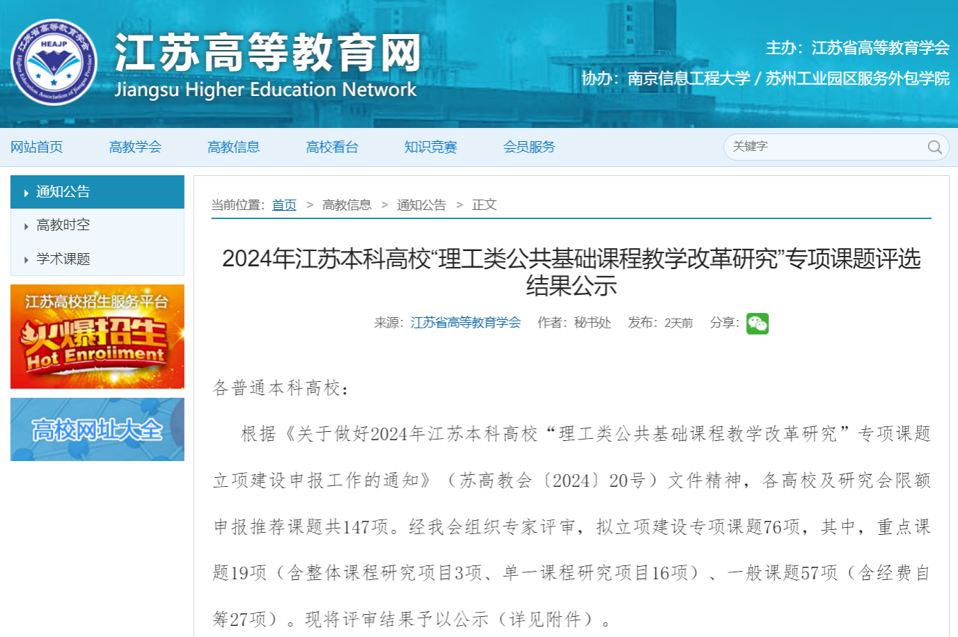 2024年7月,江苏省高等教育学会公布了2024年江苏本科高校“理工类公共基础课程教学改革研究”专项课题评选结果。91吃瓜