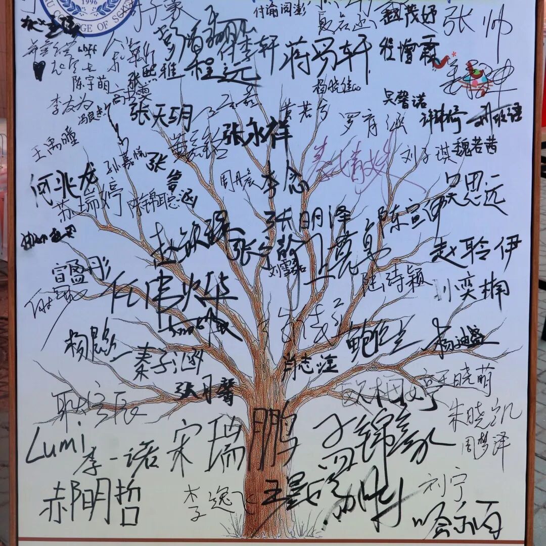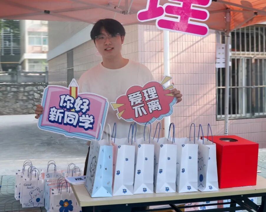 摊位格外醒目,21个“理”字牌代表着来自21个不同地区的理学新生,“爱理不离”“你好新同学”的展板,划分出签名区、咨询处和礼品发放点,由院学生会与各学长学姐组成的志愿者团队早早到位,热情接待每一位新生。