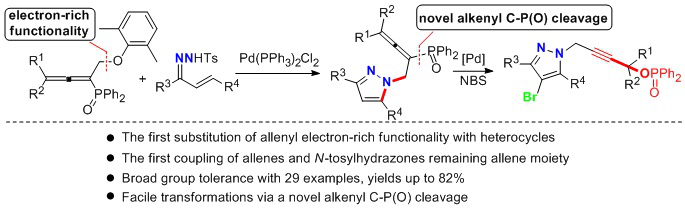 该论文首次报道了膦氧取代联烯与共轭酰腙构筑新型含吡唑杂环四取代联烯的方法,同时首次实现了钯催化选择性切断乙烯基碳-膦键与重排反应合成具潜在生物活性的吡唑炔基磷酸酯类化合物。本研究成果是该课题组前期在《ACS Catalysis》(IF: 9.307)发表工作的延续。