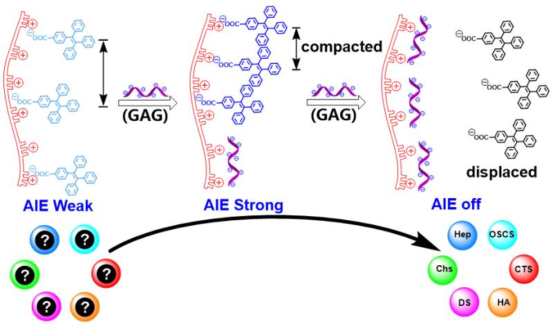 四苯乙烯分子具有典型的聚集诱导发光 (AIE) 性质,其在溶液状态下不发光,而在聚集状态下能够发出明亮的青色荧光。在本工作中,我们将聚二烯丙基二甲基氯化铵 (PDDA) 作为超分子主体,四苯乙烯甲酸 (TPE) 作为客体,通过微妙地控制 TPE 在 PDDA 上的聚集状态实现了对肝素等六种糖胺聚糖的准确鉴别。研究发现,向PDDA-TPE的组装体中加入肝素等多糖可以微妙地影响TPE分子在PDDA上的聚集状态,从而使荧光增强或淬灭。荧光信号的强弱响应不但与所加入多糖的种类相关,也取决于PDDA上TPE分子的载入量。例如,当TPE为饱和载入量时,加入的肝素等多糖通过竞争性取代TPE与PDDA结合,释放出自由的TPE导致荧光减弱乃至消失。但是当TPE没有达到饱和载入量时,加入的肝素等多糖首先直接与PDDA结合,导致TPE分子间的聚集更加紧密,AIE荧光增强直至最大值。此时若继续加入多糖则会竞争性取代TPE而淬灭AIE荧光。由此,我们构建了基于不同TPE载入量的 PDDA-TPE 荧光阵列传感器,该阵列传感器对肝素、透明质酸、硫酸软骨素、壳聚糖、硫酸葡聚糖和过硫酸软骨素表现出特异性的指纹响应图谱。通过对响应数据进行线性判别分析发现,PDDA-TPE 荧光阵列传感器可以通过模式识别的方式准确区分上述多糖。更重要的是,该阵列传感器还可以灵敏地鉴定出肝素中微量的过硫酸软骨素污染物,识别未知的多糖样品,并可用于血清样品中不同多糖的准确区分鉴定。