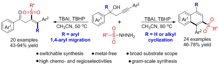近日,朱映光教授课题组采用自由基1,4-芳基迁移和环化策略,以高炔丙醇作为底物,基于底物调控,首次分别实现了四取代烯基砜和萘砜的选择性精准合成,探究并提出了两种不同的反应机理。此方法采用相同的反应条件,从高炔丙醇原料出发,能够高效快速的构建两种不同的产物。课题组正在对两类含砜产物进行相关生物活性测试。
