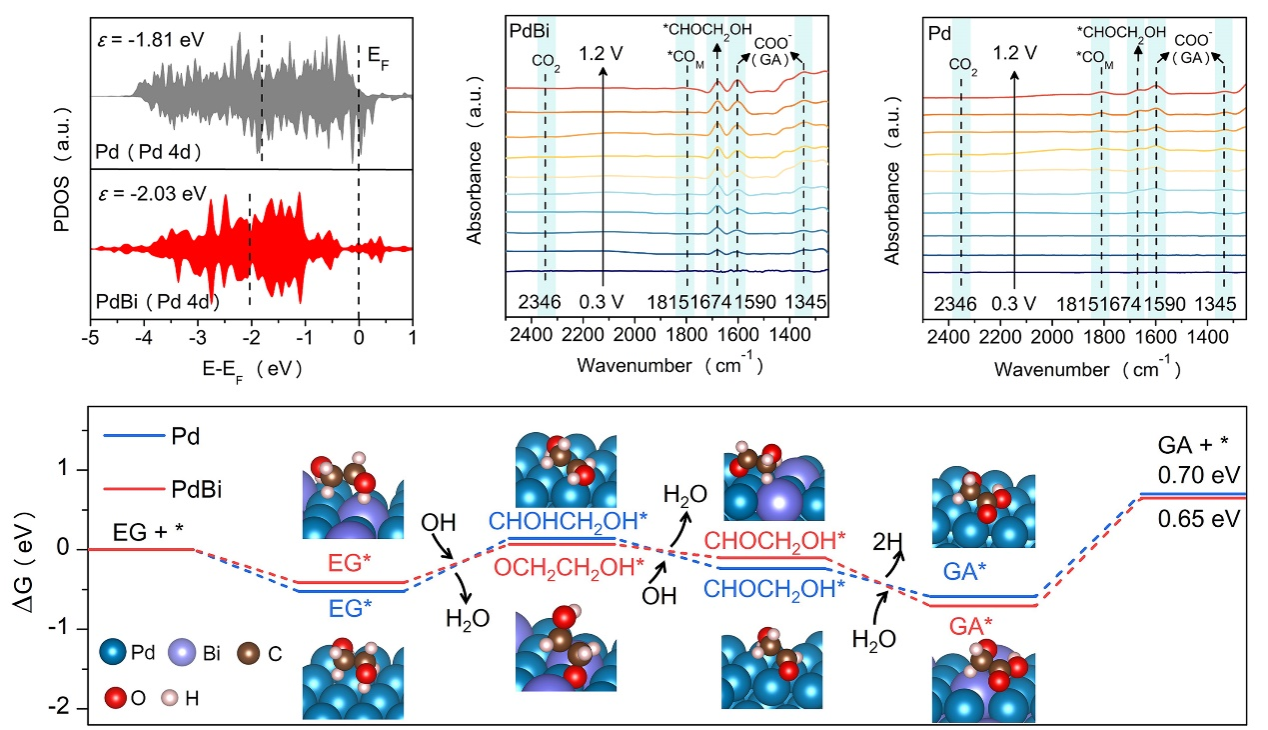 本研究提出了一种配对电解工艺概念,通过阳极塑料衍生乙二醇氧化与阴极生物质衍生草酸还原耦合以实现高附加值化学品乙醇酸的联产。该工艺通过开发具有强CO耐受性的PdBi合金阳极和温度响应型TiO₂阴极得以实现,通过理论计算与实验研究阐明了其作用机制:合金化策略使Pd的d带中心下移,削弱了毒化物种在活性位点的过度键合,显著提升乙二醇氧化生成乙醇酸反应的活性与稳定性。