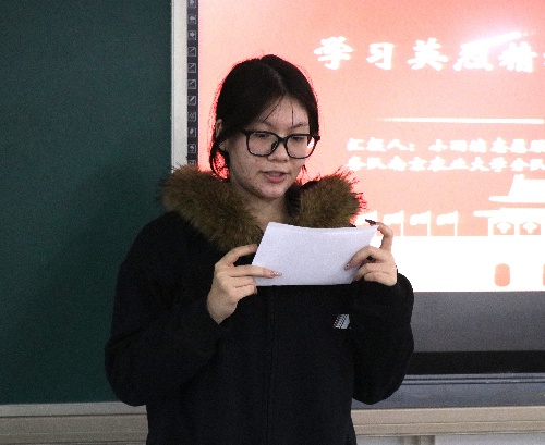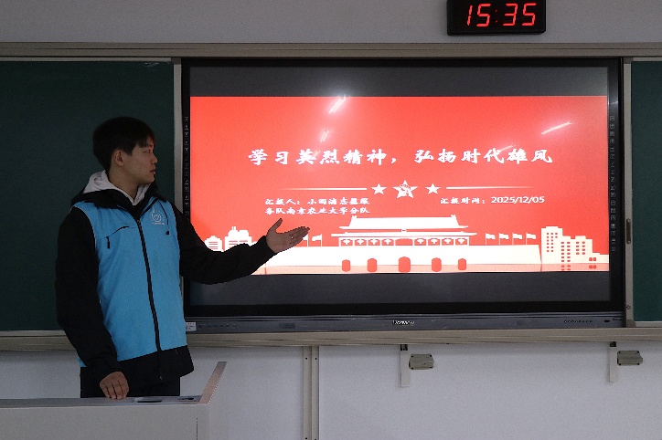 活动聚焦理论学习和精神传承。应用化学本科生党支部纪检委员、第19届小雨滴志愿服务队南农分队队长樊尚超担任“雨滴课堂”主讲人,分享了许包野、丁香、孙津川等雨花英烈的英勇事迹,带领大家学习了党史知识,并结合当前国内国际大局与同学们分享党的创新理论。